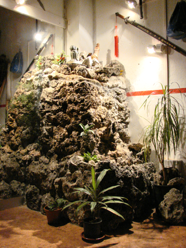 For a better comprehension of Qi Gong, Fu Ying School has an acupuncture dummy (1.80 meters tall), a latex dummy (0.5 meters tall), a skeleton, an orthopedic vertebral column, medicine balls, canes, etc. In addition, to create a perfect atmosphere, we have a waterfall of real and natural stone to recreate the sound of water in nature (see picture).